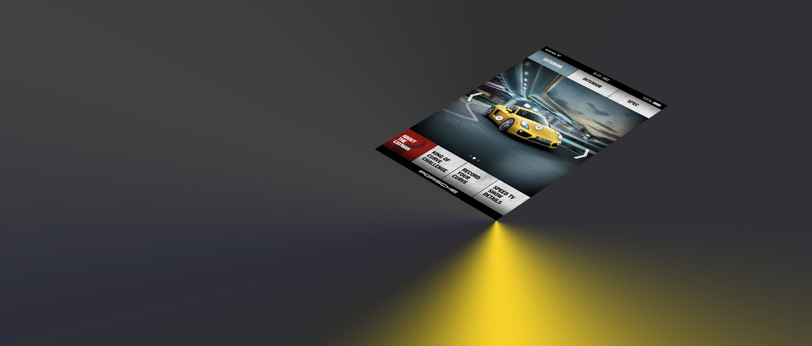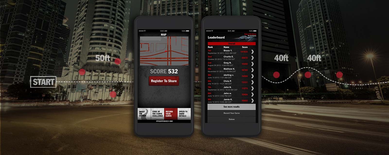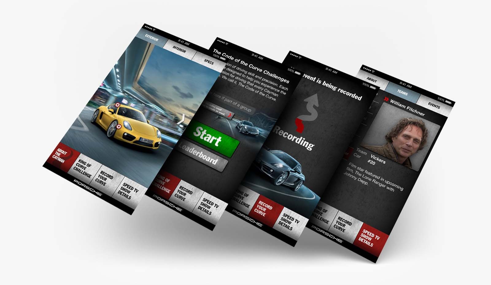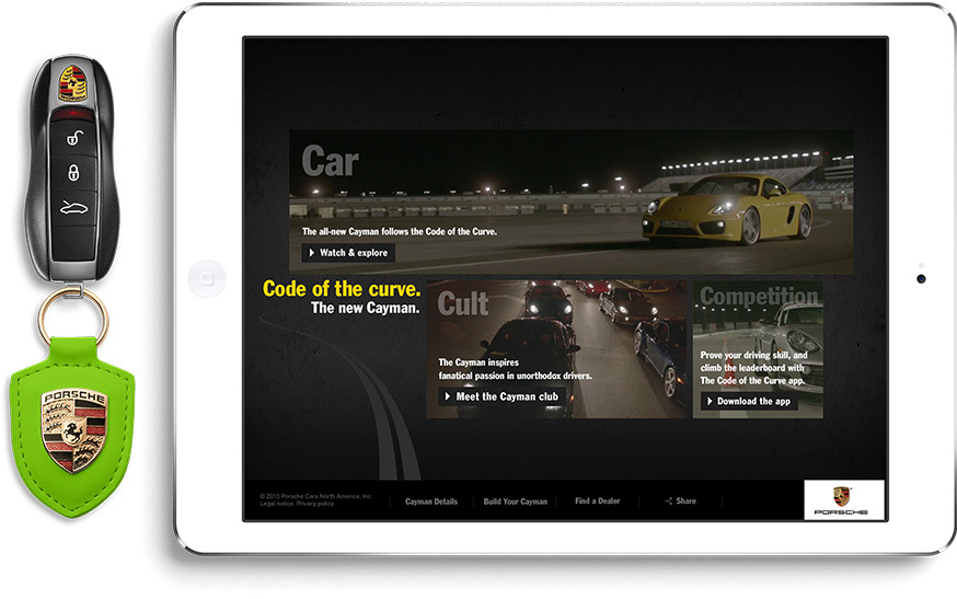 Our app was used to function as the centerpiece of a global ad campaign for the launch of the 2014 Cayman, so the pressure was on. The Cayman is all about perfomance, and precision driving, so we wanted to come up with a way for Porsche drivers to put their cars to the test, and actually measure their results.