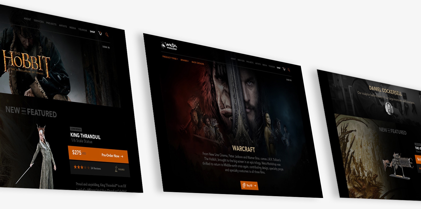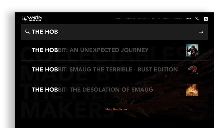 We partnered with Weta to create an e-commerce website that would service fans around the world with four warehouses and five currencies. Our role was to create a whole website production that would balance commerce and brand in a symbiotic relationship with the movies Weta is known for making.